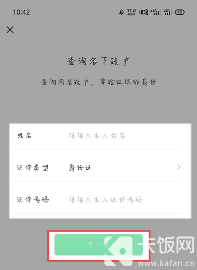 8、输入当前账号实名的身份信息,点击【下一步】;