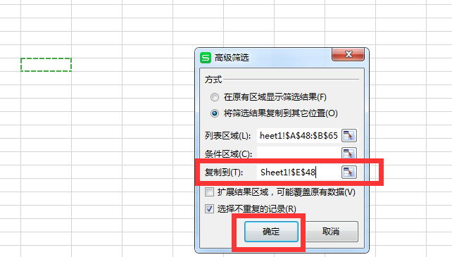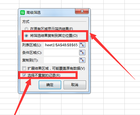 弹出窗口,如图,勾选【将筛选结果复制到其它位置】、【选择不重复的记录】,