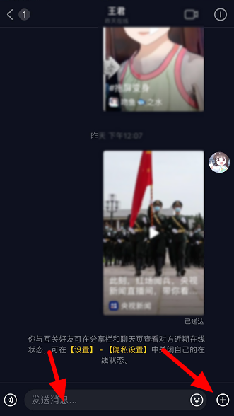 点击输入框可发送文字消息,点击【+】,可以发送图片、视频,