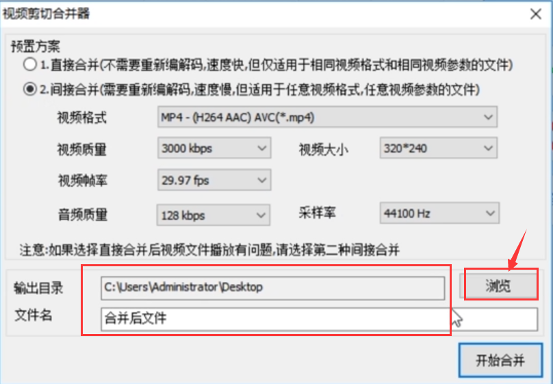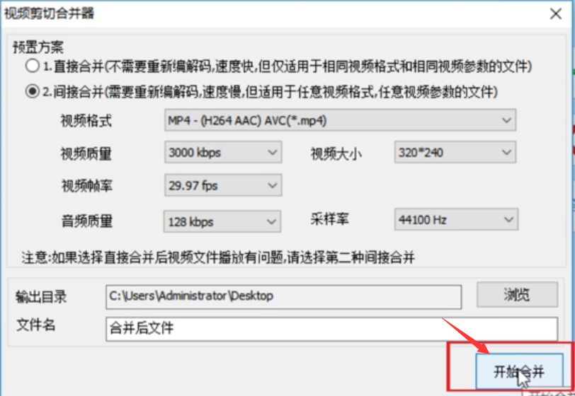 4、弹出视频剪切合并器窗口,首先根据合并视频的情况选择合适的预置方案:如果合并视频格式和参数都相同的话,就可以选择【直接合并】(这种情况很少);通常情况下选这里一般选择【间接合并】,然后在间接合并下设置合并后视频的参数信息如格式、像素、帧数、音质等。