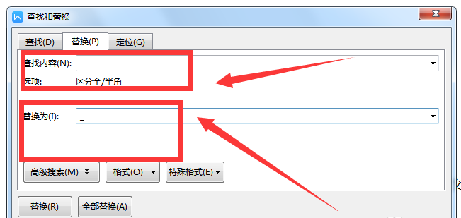如图,点击【查找内容】,输入空格,点击【替换为】,输入下划线,