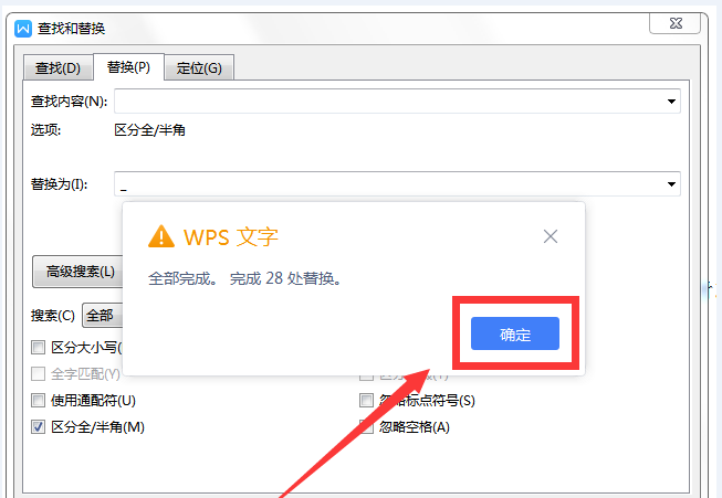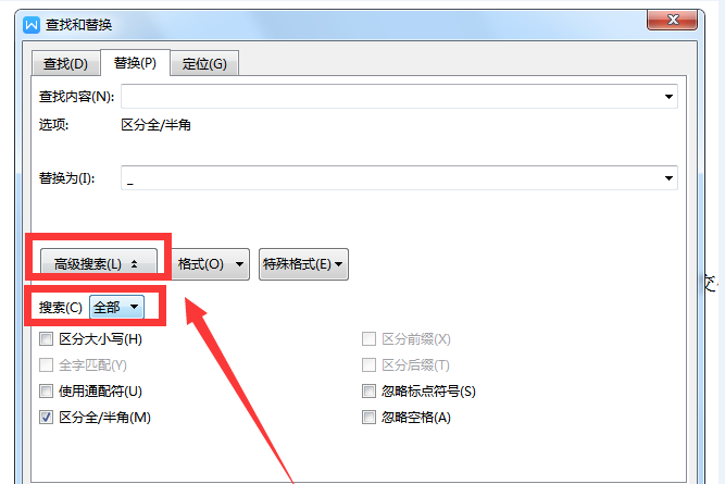 然后点击【高级搜索】,选择全部,点击【全部替换】,