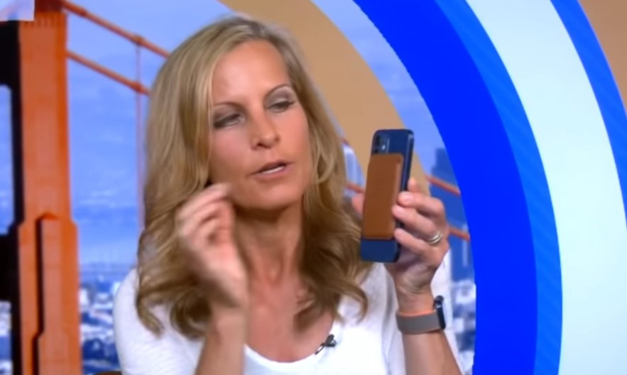 2、 MagSafe 皮革钱包,其通过磁力吸附到 iPhone 12 的背面。
