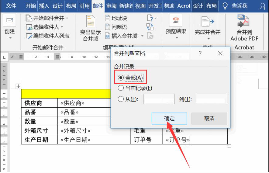 7、此时,word会弹出合并到新文档的窗口,我们在合并记录中点选“全部(A)”,并点击“确定”按钮。