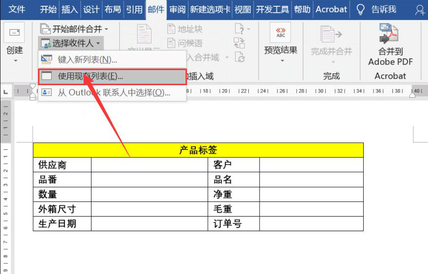 2、然后,再点击“邮件”菜单中的“选择收件人”,并从其下拉列表中点击“使用现有列表”。