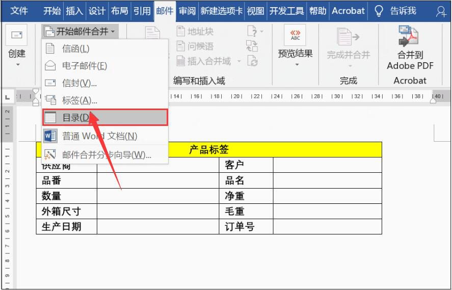 1、首先,我们在word中将事先做好的产品标签模板打开。再点击“邮件”菜单中的“开始邮件合并”,并从其下拉列表中点击“目录”。