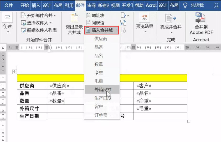 5、接下来,我们将光标分别定位到产品标签表格中的相应单元格,再点击“邮件”菜单中的“插入合并域”,并从其下拉列表中点选对应的域名放至对应的单元格,如下图所示。