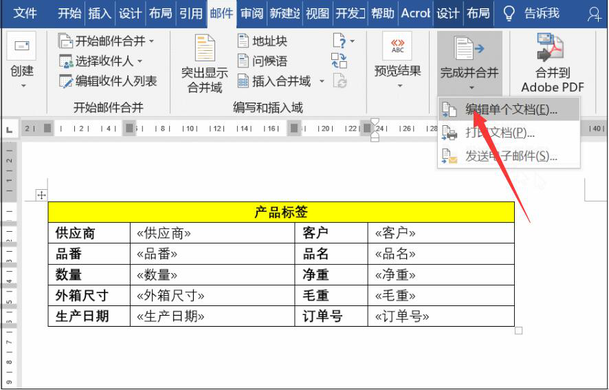 6、将word中的产品标签表的域名都编辑完成后,我们点击“邮件”菜单中的“完成并合并”,并从其下拉列表中点击“编辑单个文档”。
