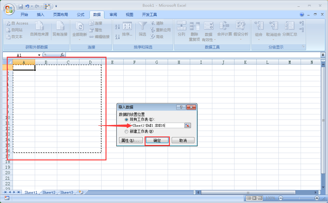 7、弹出导入数据窗口,直接在表格中框选空白单元格区域作为导入数据的放置位置,然后点击【确定】。