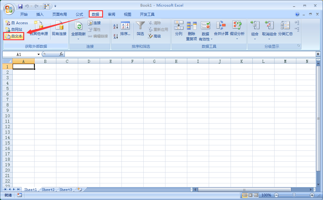 2、选择上方菜单栏中【数据】,在其功能选项页中点击获取外部数据中的【自文本】。