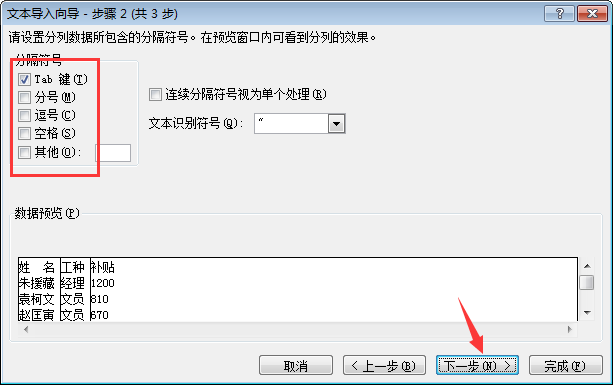 5、进入文本导入向导-步骤2,这里主要对文档中的分隔符号进行选择,这里视TXT文档中数据的分隔情况进行选择,选择之后下方的数据预览会显示导入后的单元格形式,如果不符合要求,用户可以继续勾选修改分隔符号。设置完成,点击【下一步】。