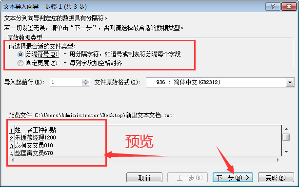4、弹出文本导入向导-步骤1,默认选择,点击【下一步】。