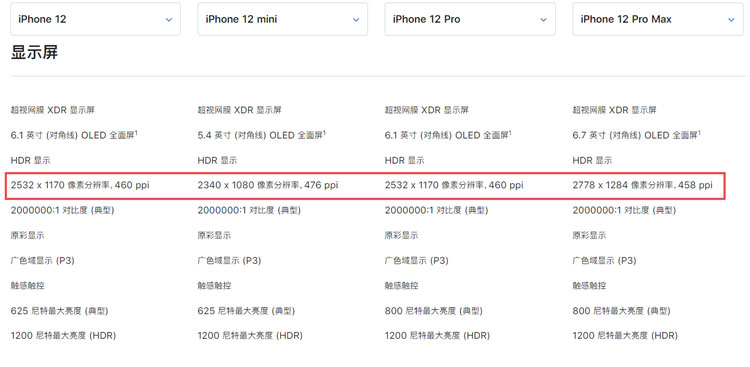 4、iPhone 12 Pro Max:2778 x 1284 像素分辨率,458 PPI ;