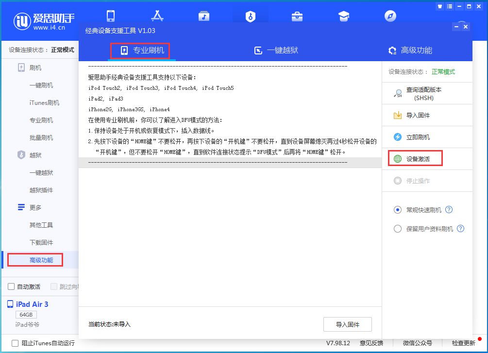 6、刷机完成,等待设备重启,然后点击【刷机越狱】,在左侧选择【高级功能】,在右侧点击【设备激活】即可。