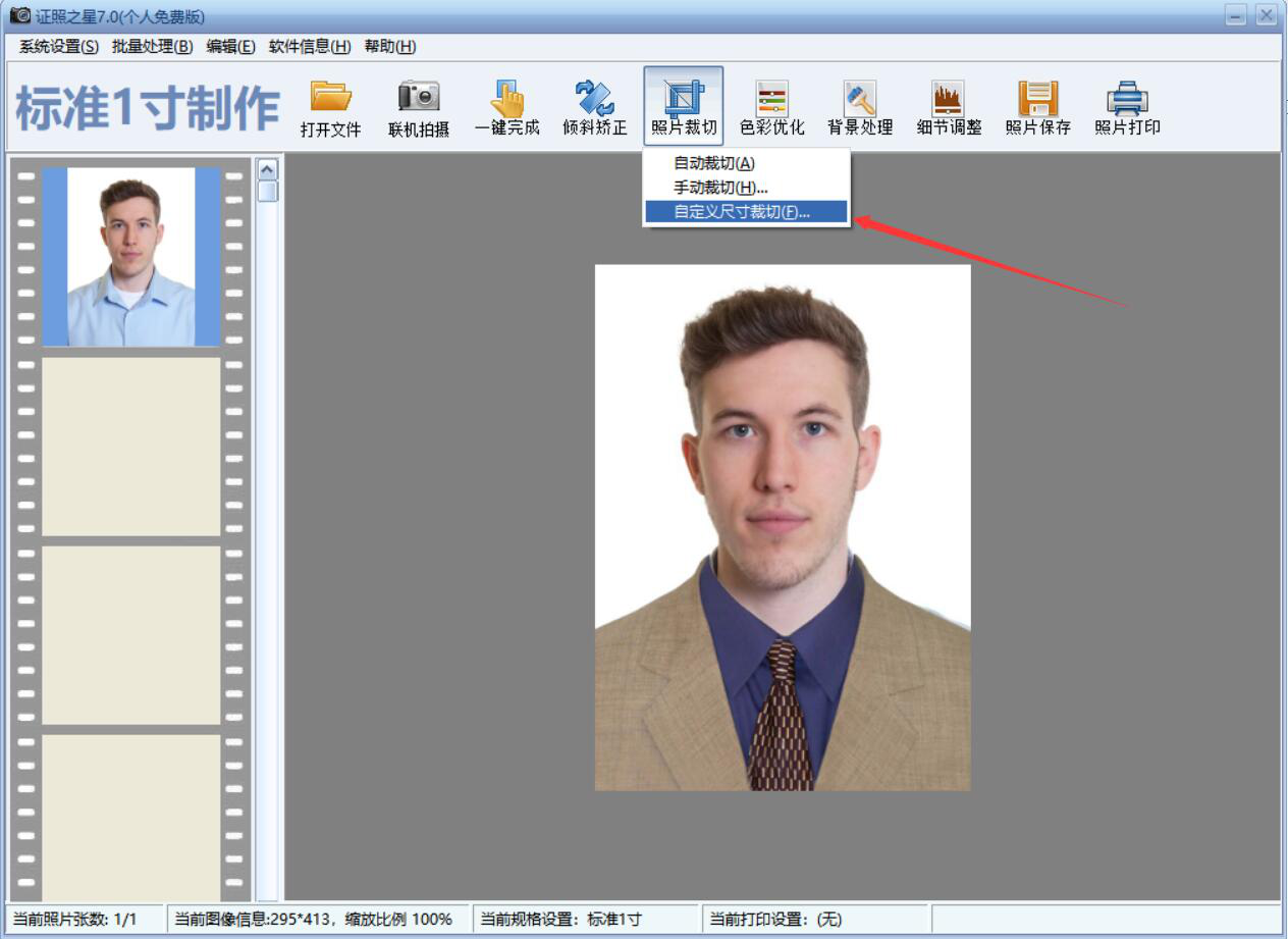 7、接着,我们可以看到换了正装后的证件照更美观了,可是尺寸却由于刚才的裁切发生了变化。我们再次点击“照片裁切”菜单,从中点击“自定义尺寸裁切”。