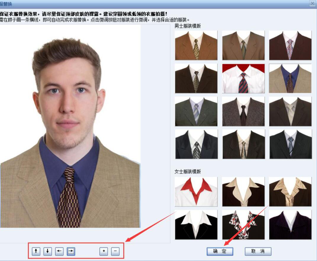 3、在衣服替换窗口中,我们按住鼠标左键在人物的脖子处画一条横线。这一条横线就是换正装时,领口摆放的位置。画好后,从右侧的正装模板中点击应用自己喜欢的。但是,正装的大小、位置还需要调整。