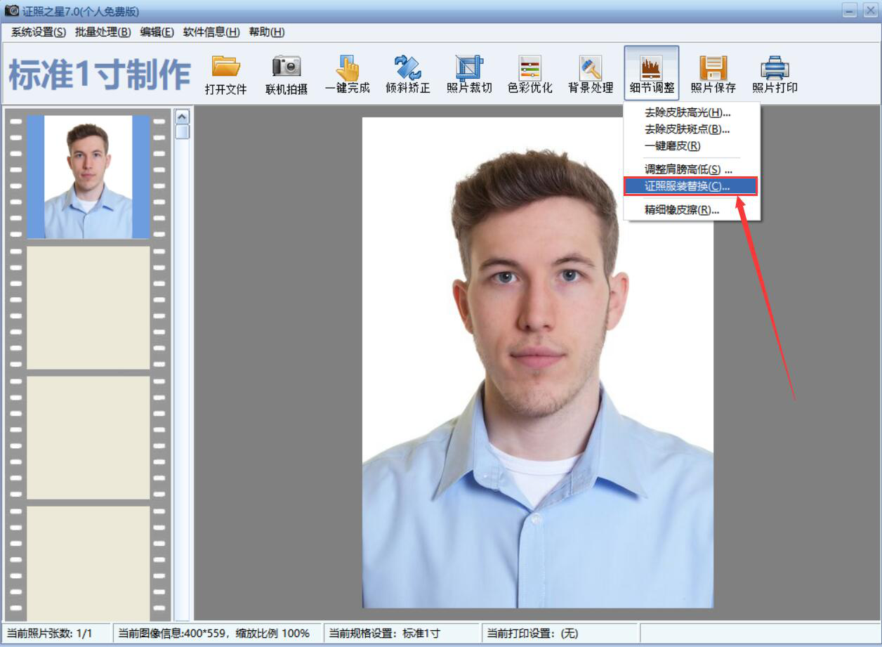 2、然后,点击“细节调整”菜单中的“证照服装替换”,正式进入证照之星换正装的环节。