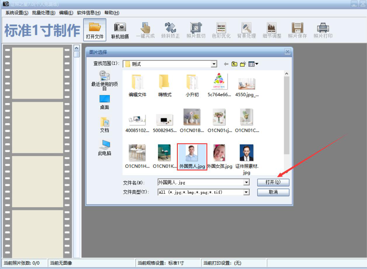 1、首先,我们点击证照之星的“打开文件”按钮,在弹窗中将需要换正装的证件照选中并点击“打开”按钮。