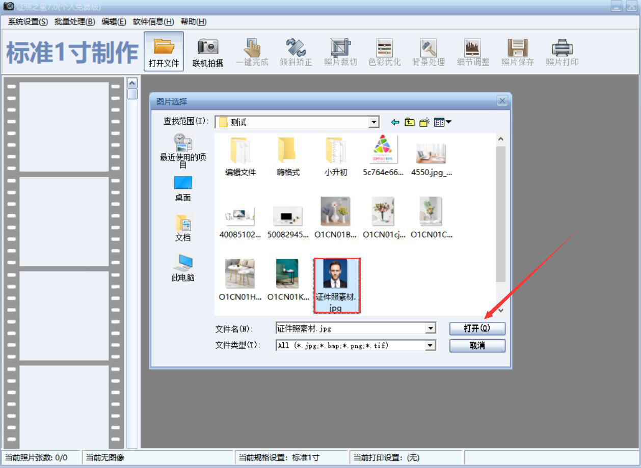 2、此时,在弹窗中将需要使用证照之星智能背景替换功能的照片选中,并点击“打开”按钮。