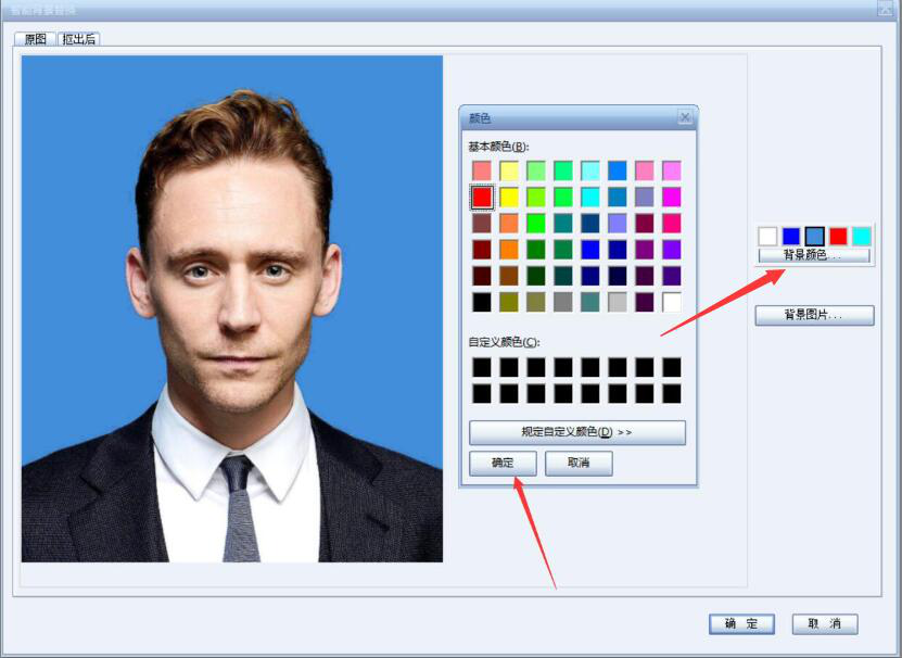 6、继续在证照之星的智能背景替换窗口中,点击“背景颜色”按钮,弹出颜色窗口,点击自己喜欢的背景色,再点击“确定”按钮。