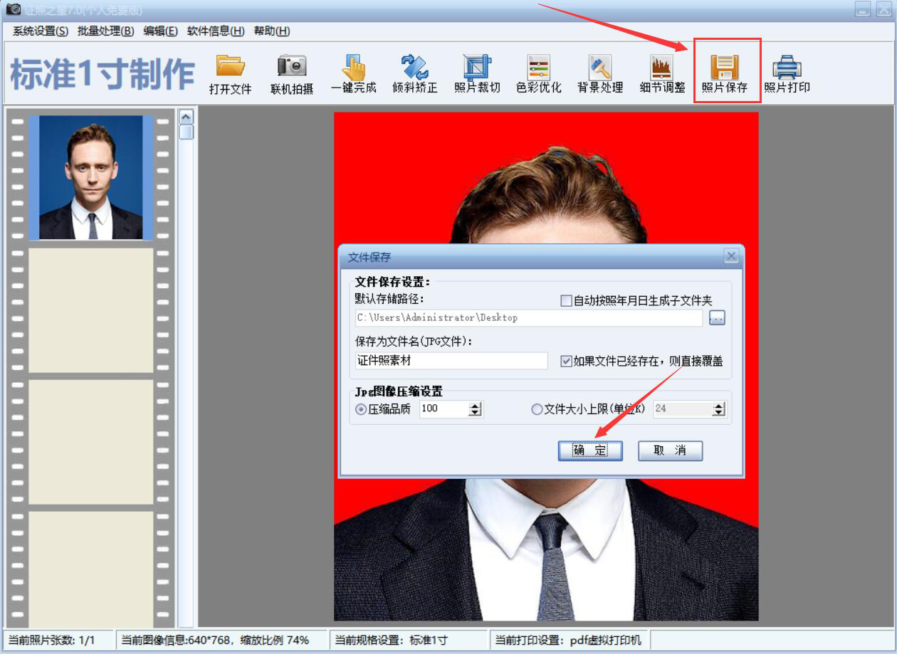 8、最后,回到证照之星的主界面。点击“照片保存”按钮,弹出文件保存窗口,我们可以自定义保存路径等等,再点击“确定”按钮,证照之星便会将这个用智能背景替换功能改了背景后的照片给保存起来。