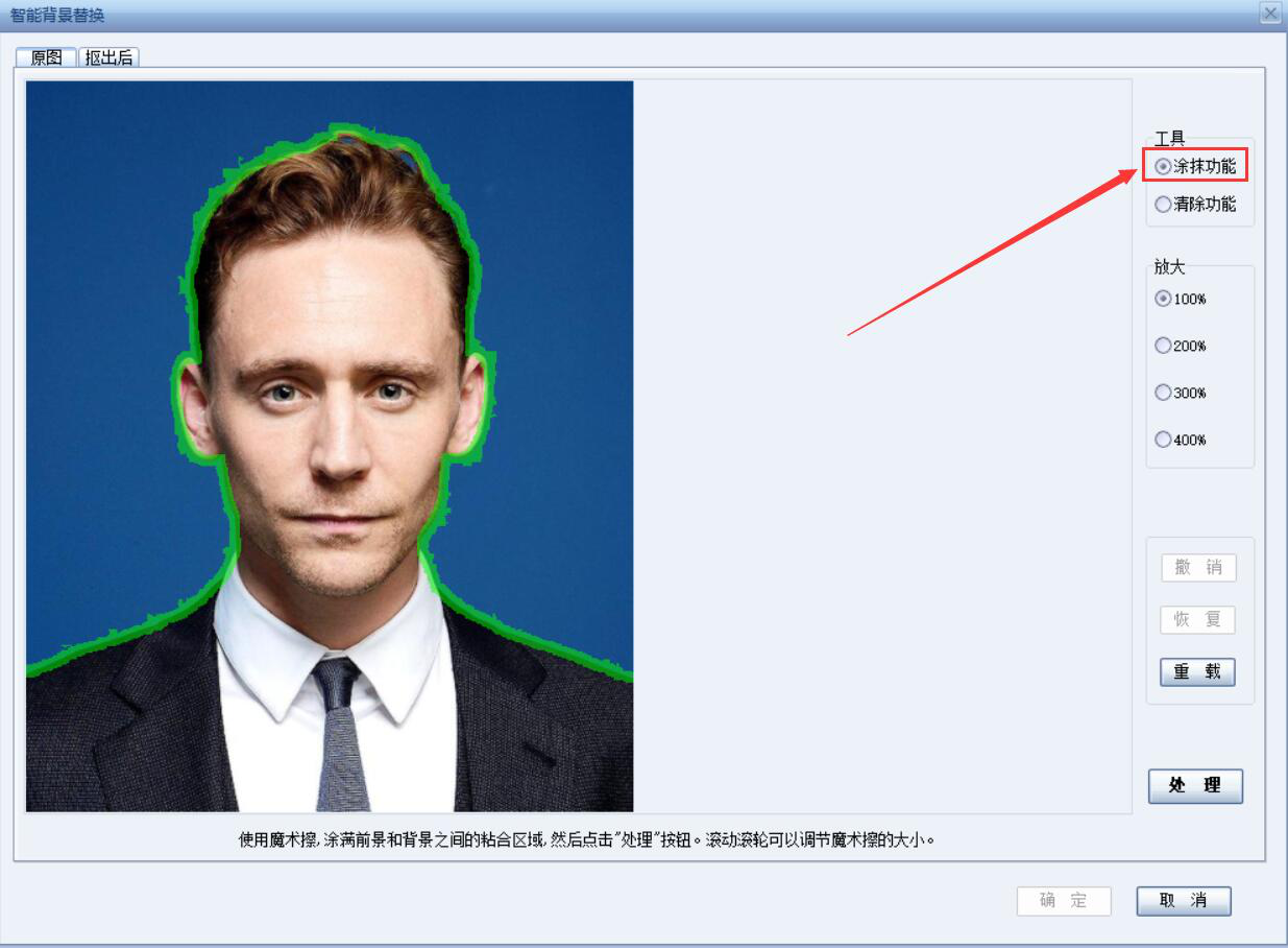 4、证照之星便会弹出智能背景替换的窗口。我们点选“涂抹功能”,软件便会自动识别出人物的范围,并自动绘制好人物和背景的分界区域。如下图,绿色的便是分界。但是细看的话,可以看到头发的有些地方没抠中。