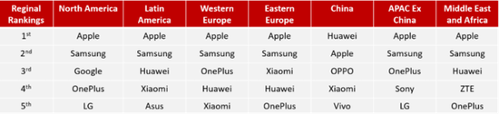 根据调研机构 Counterpoint 的 2020 Q1 的数据显示,在 Counterpoint 划分的高端机市场中,一加在北美和欧洲等发达地区排名进入了前五,北美是第四,西欧是第三,东欧是第五。作为上榜品牌中最年轻的企业,一加展现了巨大的潜力。