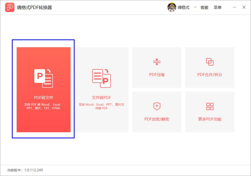 3、点击打开安装好的嗨格式PDF转换器,可以看到在如图界面中有多个选项,点击最左侧的【PDF转文件】。