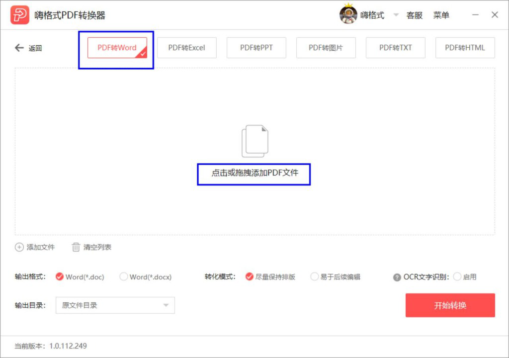 5、PDF文件添加完成后就会显示在列表中,在输出格式中选择【.DOC】或【.DOCX】,然后在转换模式中选择【尽量保持排版】,设置好之后点击【开始转换】即可。