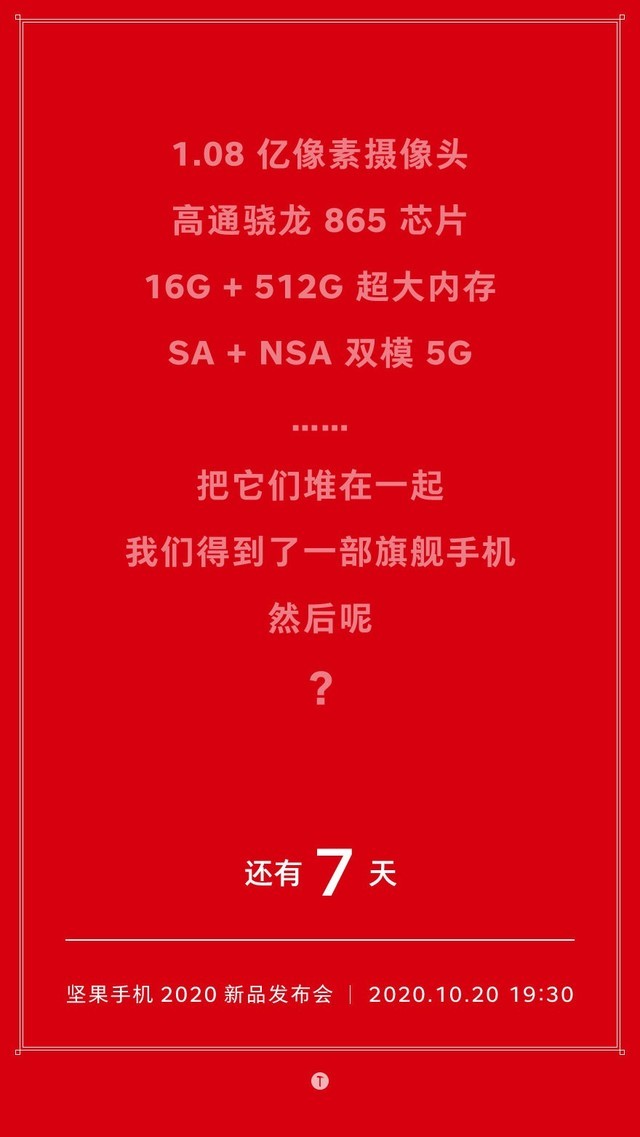 根据坚果手机官方提供的信息,新机器将配备Snapdragon 865处理器,还将配备一亿像素主摄像头,最高支持16+512GB的存储组合,双模5G和更多全新特性。