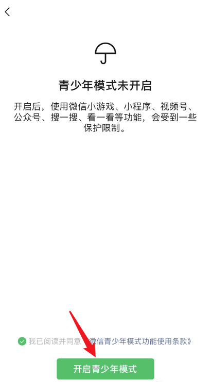 跳转至以下界面,青少年模式未开启,阅读使用条款,选择同意,点击【开启青少年模式】,