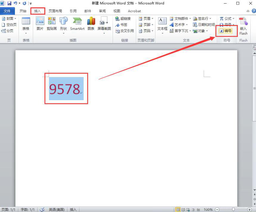 3、接下来,将word的阿拉伯数字选中,点击“插入”菜单中的“符号”,并点击“符号”中的“编号”。