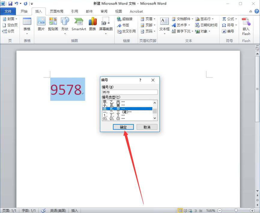 4、此时,word会弹出编号的窗口。因为我们是要将阿拉伯数字转成大写数字,所以,这里,我们在编号类型中选择大写的数字类型,再点击“确定”按钮。