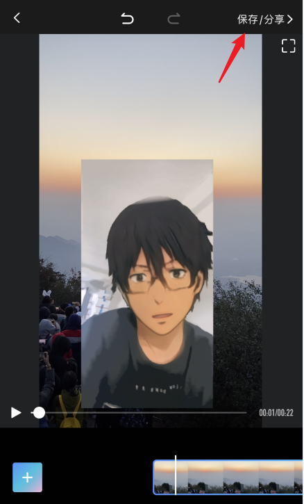 视频处理完成,点击右上方的【保存/分享】选项,即可导出视频。