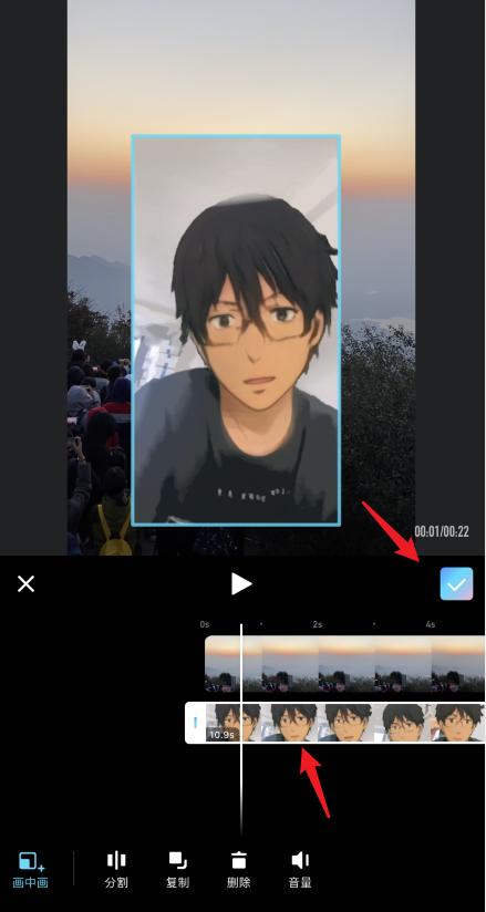 添加完成,在下方也可以设置画中画出现和结束的时间,设置之后,点击确定,