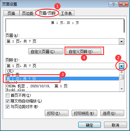 3、弹出页面设置窗口,选择【页眉/页脚】标签页,点击页脚右侧倒三角图标,在下拉菜单中选择页码形式“第1页,共?页”,然后点击【自定义页脚】。