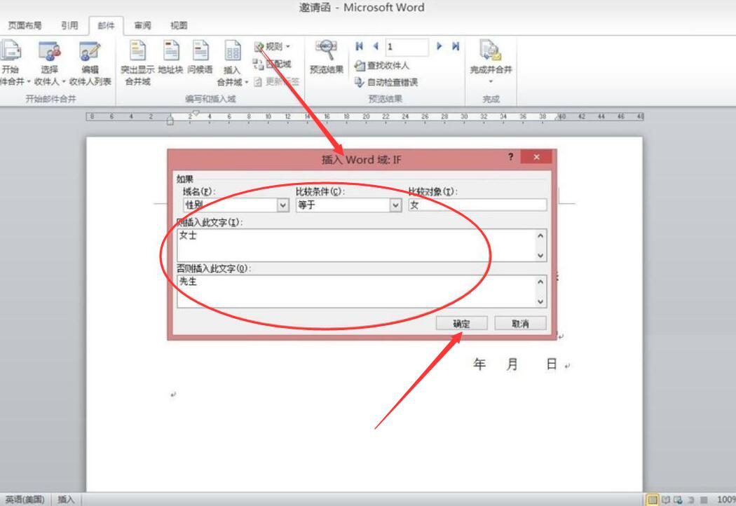 8、弹出插入word域的窗口,域名选择“性别”;比较条件选择“等于”;比较对象选择“女”,而“则插入此文字”的文本框中输入“女士”;而“否则插入此文字”的文本框中却输入“先生”,再点击“确定”按钮。