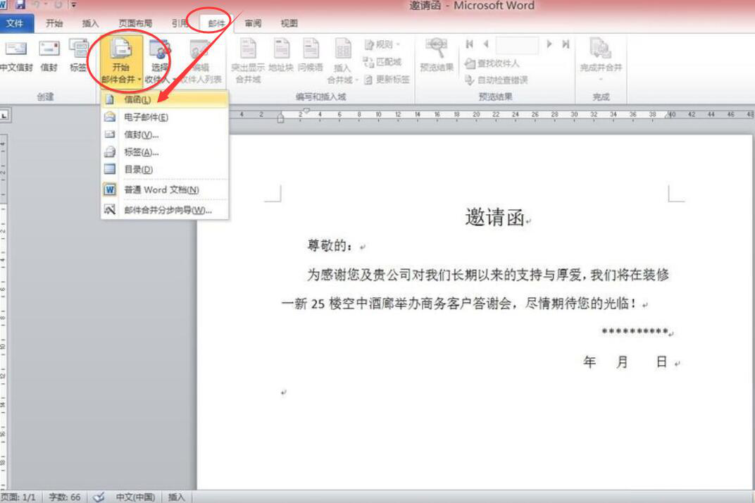 3、完成以上两步,我们点击“邮件”菜单中的“开始邮件合并”,并从其下拉菜单中点击“信函”。