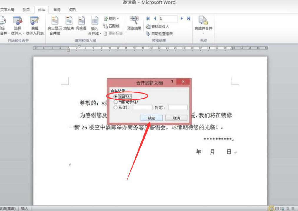 10、因为是要用word批量制作邀请函,所以,我们要在弹出的合并到新文档的窗口中点选“全部”,再点击“确定”按钮。
