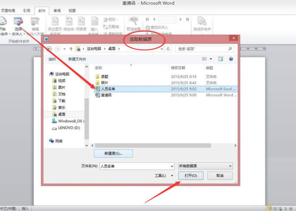 5、接下来,弹出选取数据源的窗口,将第1步制作好的邀请函嘉宾人员名单选中,并点击“打开”按钮。