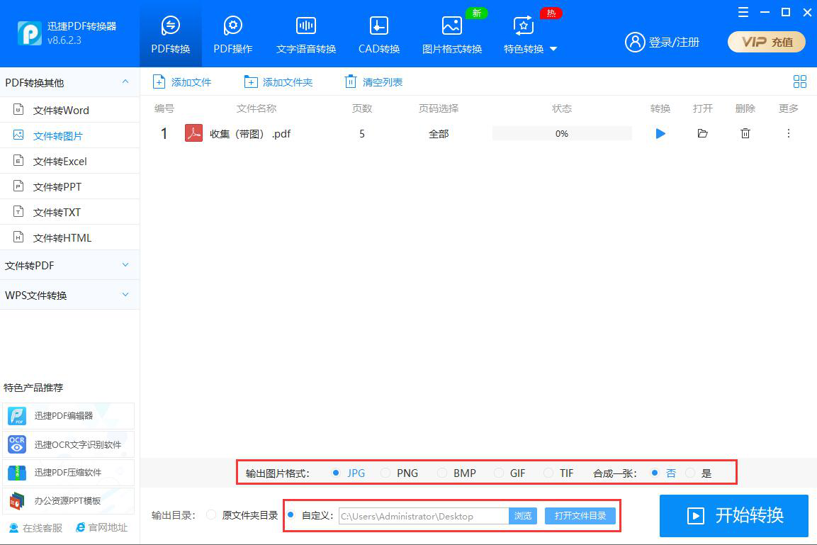 3、然后,在迅捷PDF转换器中,我们根据自己的需要设置PDF文件转为图片的输出格式和目录。
