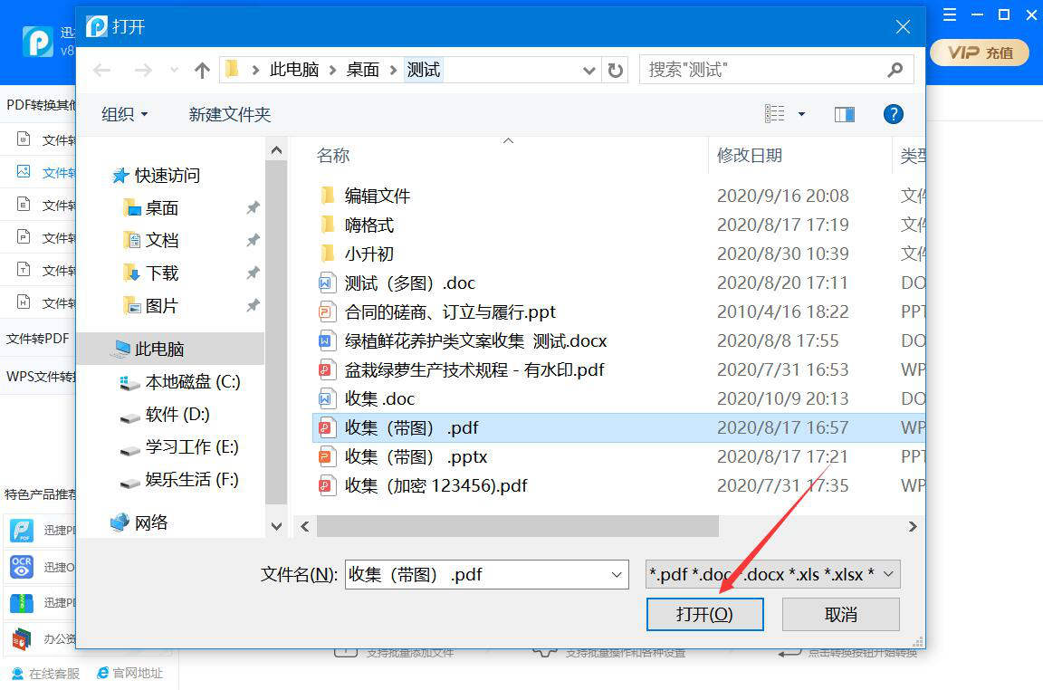 2、此时,在弹窗中,我们将需要转换为图片的PDF文件选中,点击“打开”按钮,将其导入迅捷PDF转换器。