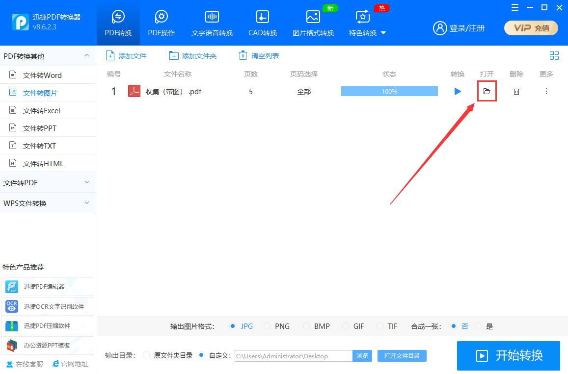 6、当状态为100%的时候,说明迅捷PDF转换器成功将PDF文件转为图片了,我们点击“打开”中的文件夹按钮便可以看到转换的效果了。