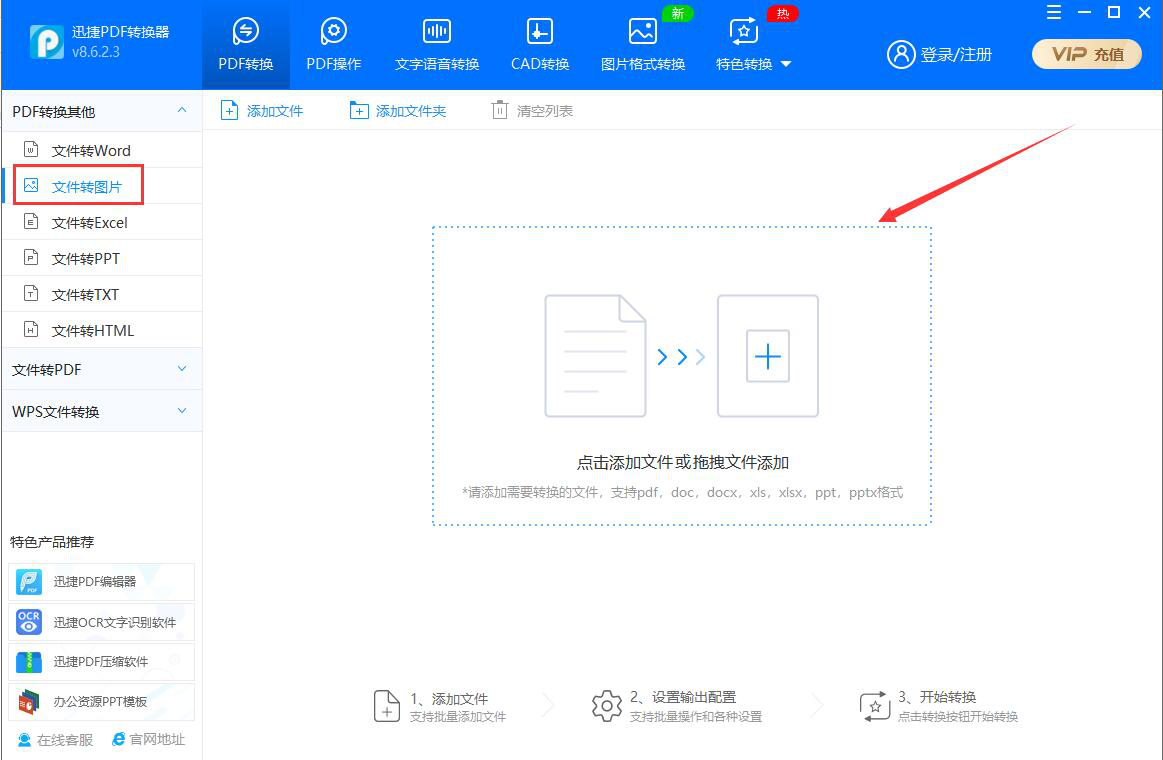 1、首先,我们打开迅捷PDF转换器。进入“PDF转换”操作界面,切换至左侧栏中的“文件转图片”选项,并点击右侧界面中的“+”按钮。