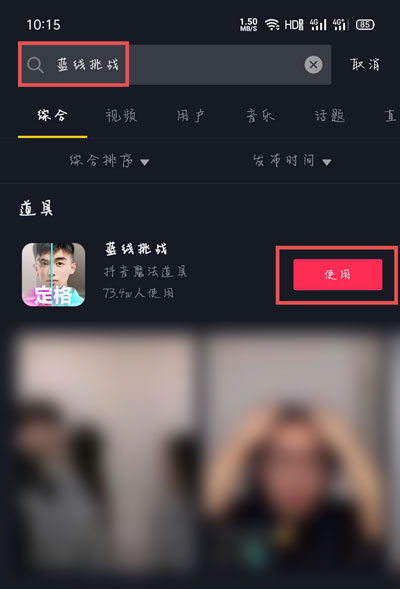 2、然后在输入框中输入并搜索【蓝线挑战】,找到拍摄创意定格照特效,点击【使用】;