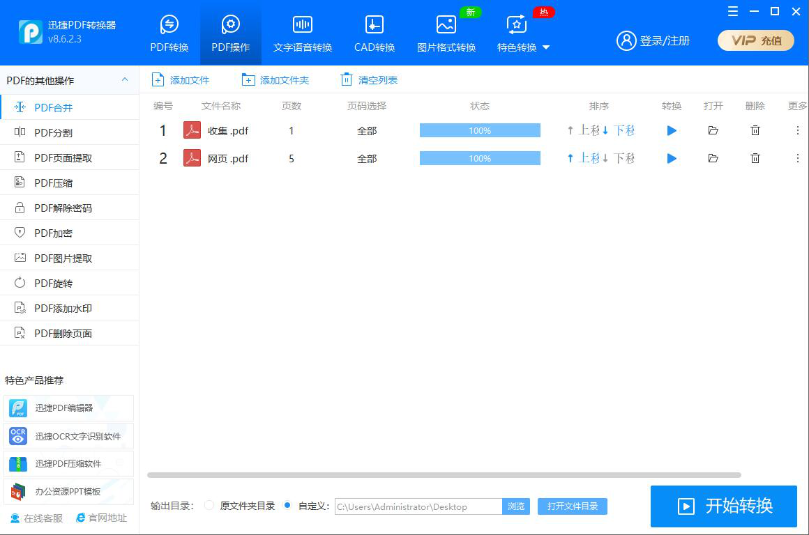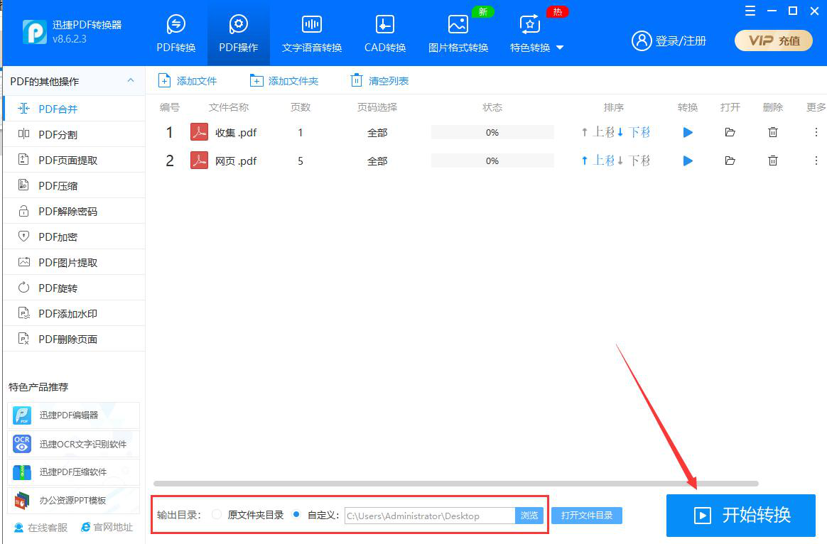 4、接下来,如果默认的输出目录需要修改的话,就点击“浏览”按钮自定义PDF合并后的保存路径,再点击“开始转换”按钮,迅捷PDF转化器便执行合并PDF文件的指令。