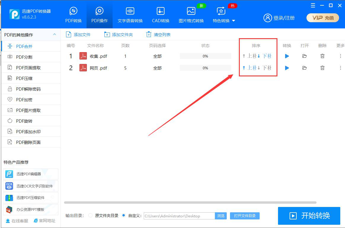 3、然后,在迅捷PDF转换器中,我们先对需要合并的PDF文件进行排序。