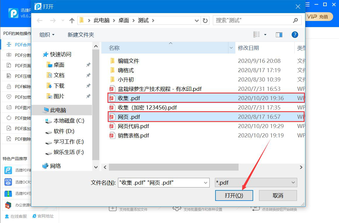 3、在弹出的窗口中,我们将需要合并的PDF文件分别选中,并点击“打开”按钮,将它导入迅捷PDF转换器。