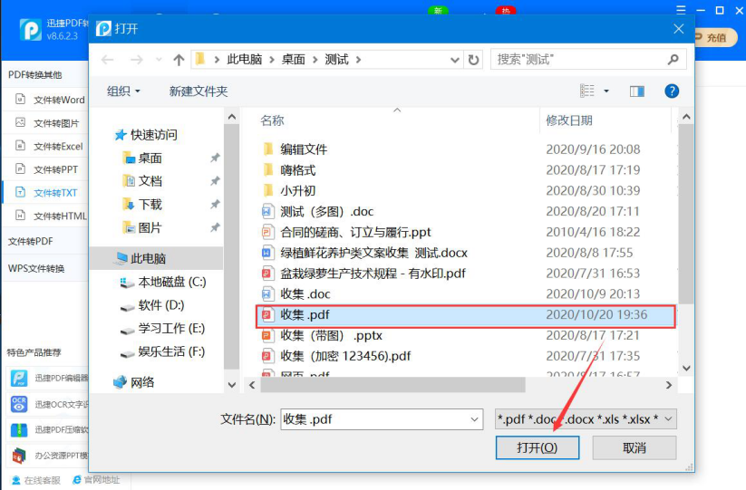 2、在弹出的窗口中,将需要转换为TXT的PDF文件选中,并点击“打开”按钮,将它导入迅捷PDF转换器。