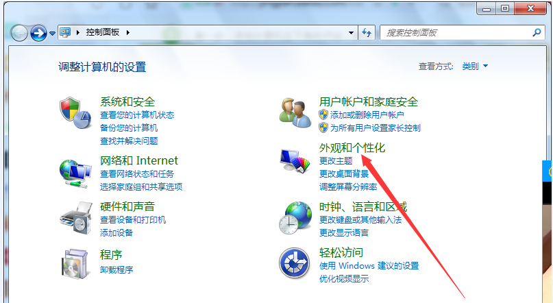 打开控制面板,设置【查看方式】为类别,点击【外观和个性化】,